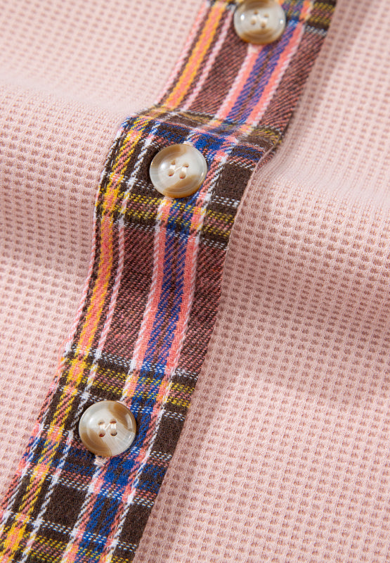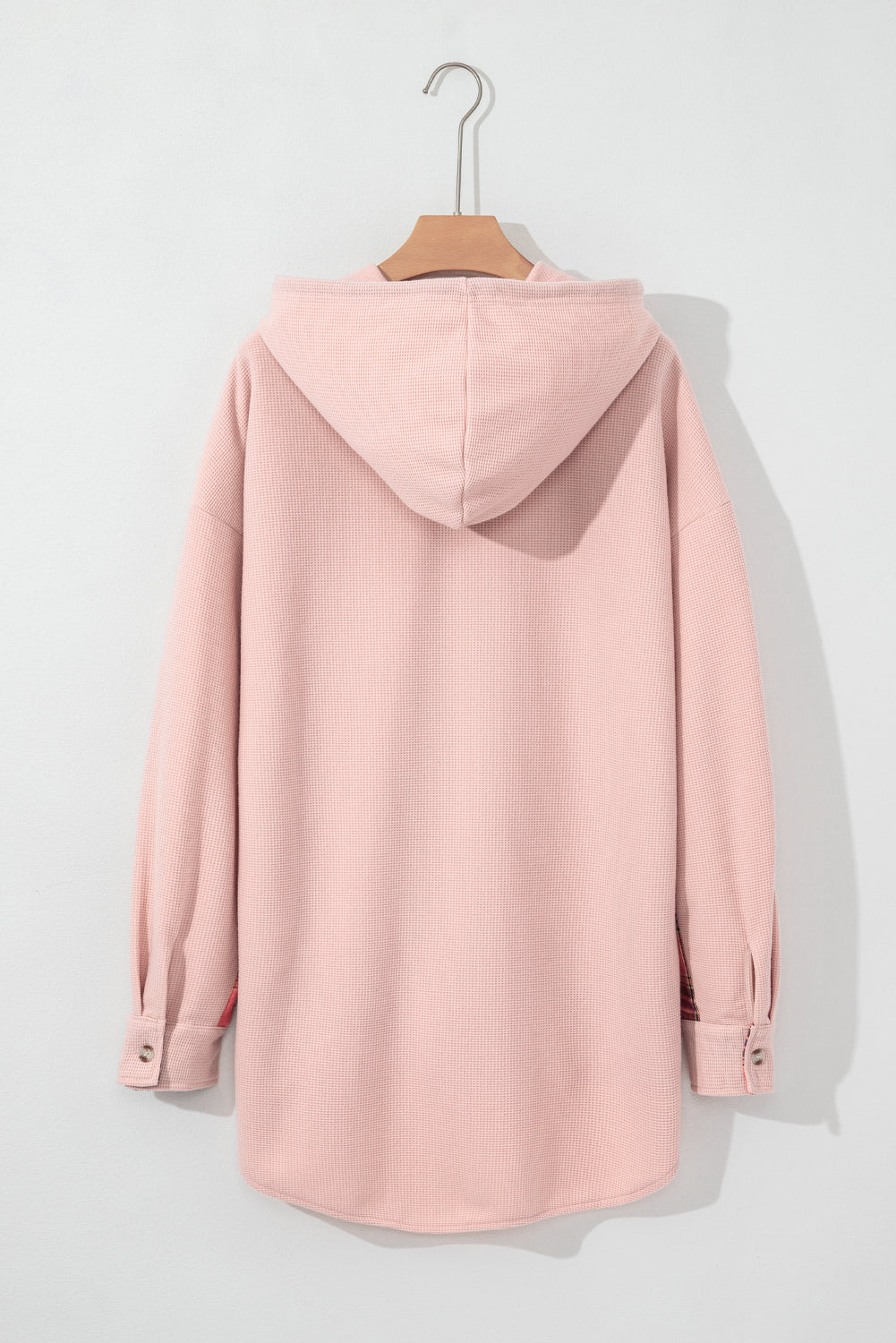 Waffle Knit Plaid Patchwork Drawstring Hooded Shacket